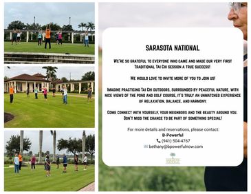 Wednesdays 8-9 AM September 10, 17, & 24 outdoors on the green turf area overlooking the water between the Palm Club and Golf buildings. During inclement weather, classes will be held inside the Fitness Center Group Exercise Room , Studio 1. Please pre-sign-up for class on the Sarasota National website fitness class registrations.